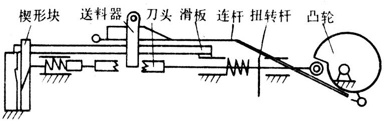 其工作原理是从莲子长径方向切入莲子壳并使壳扭碎而实现脱壳。结构如图2,工作时,送料器先将莲子从料斗中纵向送到前后刀头之间,使莲子的长径方向对准前后刀头,将莲子夹持,借楔形块自动定位,使前后刀头与莲子之间无间隙;刀头再各纵向进刀1毫米左右(相当莲壳厚度,此厚度可视莲壳的厚度进行调节),接着前刀杆在扭转杆的带动下旋转一定的角度,将莲壳扭碎,前刀头快速退回,同时楔形块抬起,壳、肉已分离的莲子掉入分选筛,壳、肉从不同的出口排出,整个工作过程都由凸轮和连杆控制。