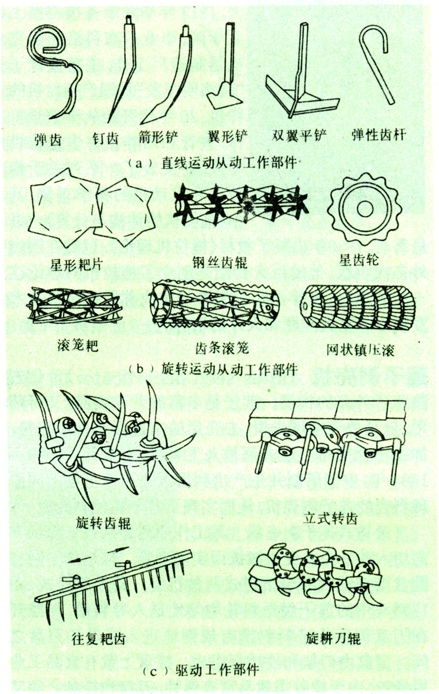 在已耕地上,将碎土、松土、平整、镇压等播前整地作业项目中的若干项联合一次完成。通常由图2所示的三类工作部件组合而成。