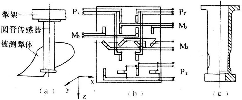 用圆管传感器代替犁柱[图3(a)],一端与犁托连接,另一端与犁架连接。传感器的布片和接桥方式如图3(b)所示。由于犁体工作阻力的垂直分量Pz较小,因此在Pz测量回路贴片处将管壁减薄[图3(c)],可提高测量灵敏度。立管式配置的优点是使用方便,能安装在现有的犁架上同时进行几个犁体的测量,但垂直力的测量灵敏度较低。