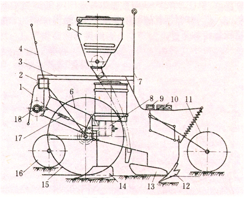 综合号耕种机有4行和6行两种与轮式拖拉机配套的机型,用于大豆、高粱、谷子等作物的起垄播种。开沟器为芯铧式,开沟宽度可达18厘米。