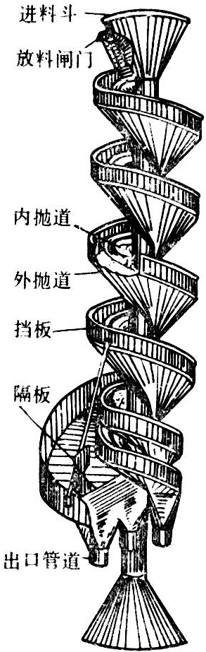 利用静止的螺旋面对不同形状物料进行分选的装置,亦称荞子抛车。在面粉厂用于分离小麦中的荞子、豌豆等球形杂质。其主要工作部件为垂直放置的几层螺旋面,利用荞子和豌豆在螺旋面上运动时所受摩擦阻力的不同,其下滑(滚)的速度和轨迹也不相同而实现分离的。