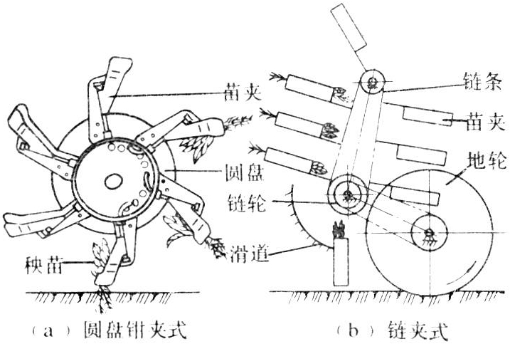 栽植器是栽植机的主要工作部件。按结构型式可分为圆盘钳夹式、链夹式和挠性双圆盘式。圆盘钳夹式栽植器[图(a)]的苗夹固定在旋转的圆盘上作圆周运动;链夹式栽植器[图(b)]的苗夹安装在循环运转的链条上,可使供苗区内苗夹数大于2,且供苗时的移动线速度低于栽植时的线速度,有利于人工供苗,提高供苗的准确性。挠性双圆盘式栽植器由两个可以弯折的圆盘组成。两个圆盘同时转动,在一定角度位置互相接触夹住秧苗,至垂直地面位置时松开,秧苗落入栽植沟内。这种栽植器在圆周任何位置都可夹秧苗。有的栽植器由一个橡胶圆盘和一个金属圆盘组成。栽植手将秧苗放入供苗输送带上,由输送带送入两个圆盘之中而被夹住,带到栽植沟里。若栽植机采用双橡胶圆盘栽植器与卷苗机配套使用时,应预先将秧苗夹在两条带子中间制成苗捆。栽植时,逐渐打开苗捆,秧苗被两个橡胶圆盘夹住,进行自动栽植。