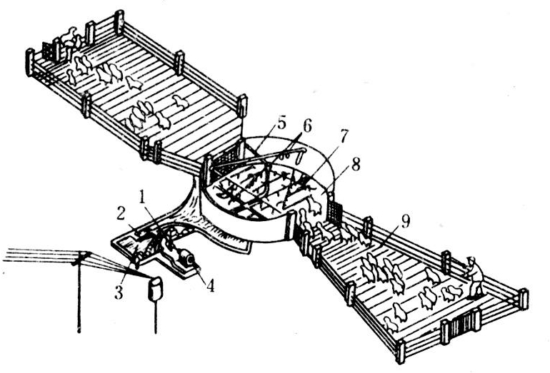 除对绵羊消灭体外寄生虫外,还适用于猪、马、牛、驼等,且能兼作卫生清洗。有上淋下浴和上淋下喷式两种,后者应用较广。由机械和土建两大部分组成(图)。其土建部分包括淋场、待淋栏、药液池、过滤池等。药液可循环使用,在滤液栏内还可进行检疫、分群等工作。机械部分主要由上淋下喷管道、喷头、阀门、过滤筛、搅拌器、水泵等组成。上淋管道设有推进喷头,利用水流的反作用力,使上淋部分均匀旋转,上部喷头喷出扇形水网,以喷淋羊只背部和头部为主;下部喷头分设在淋场各个部位,向上喷出药液组成圆形水网,以喷淋羊只腹部。从羊身上滴下的药液经过滤筛过滤后,流回药液池,供循环使用。