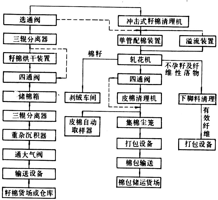 清除籽棉中的各种杂质,使棉纤维(皮棉、短绒)与棉籽分离,然后将皮棉和短绒分别压缩捆扎成包的机械设备。