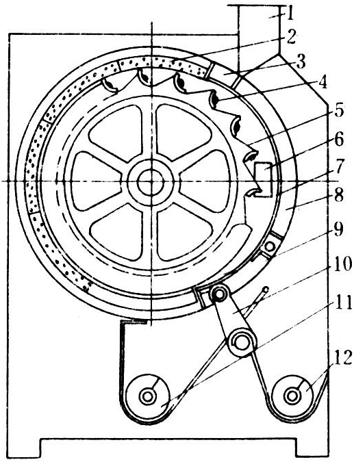 由若干块金刚砂组成的砂瓦工作面和拨籽叶片辊筒组成(图2)。在辊筒离心力和叶片推动下,棉籽紧贴金刚砂磨料的弧形表面移动,被金刚砂粒的边棱把短绒脱下,由气流吸绒道送至集绒装置,杂质坠落于排杂螺旋输送器排出机外,棉籽由出籽口排出。磨料脱绒机结构简单,维修方便,安全性能和劳动环境好;生产效率同锯齿剥绒机相近。但不能分道脱绒,脱出的头道短绒长度偏短,二、三道绒的长度也不易准确掌握,排出的棉籽光毛程度不够均匀。