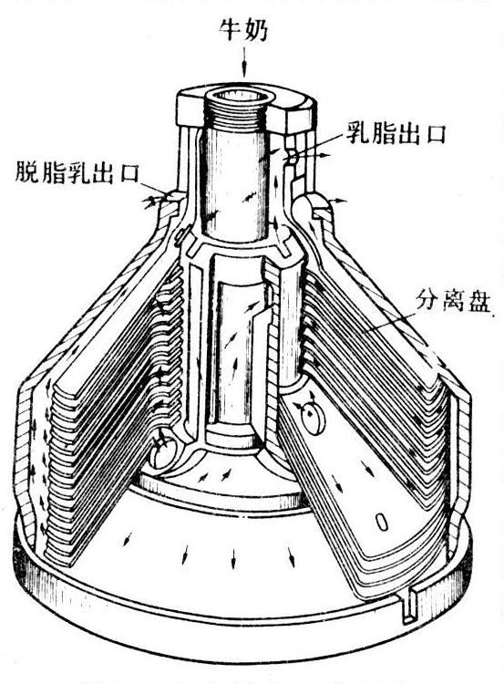 分离钵的工作过程(图2)是:牛奶从中央管进入,经盘托沿各分离盘小孔上升,在分离盘之间形成薄层。分离钵高速旋转,使牛奶获得很大的离心力,转速愈高脱脂乳与乳脂离心力的差异也愈大。脱脂乳被甩向分离钵外圈,经上分离盘与分离钵盖之间的空隙,从脱脂乳排出口排出。乳脂则向着与离心力相反的方向“上浮”,在盘托周围集中、上升,从乳脂排出口排出。在乳脂排出口处有调节螺钉,拧入螺钉,使出口处的断面减小,乳脂流出量减少,浓度增加。乳脂与脱脂乳容积比的调节范围规定为1∶3~12。