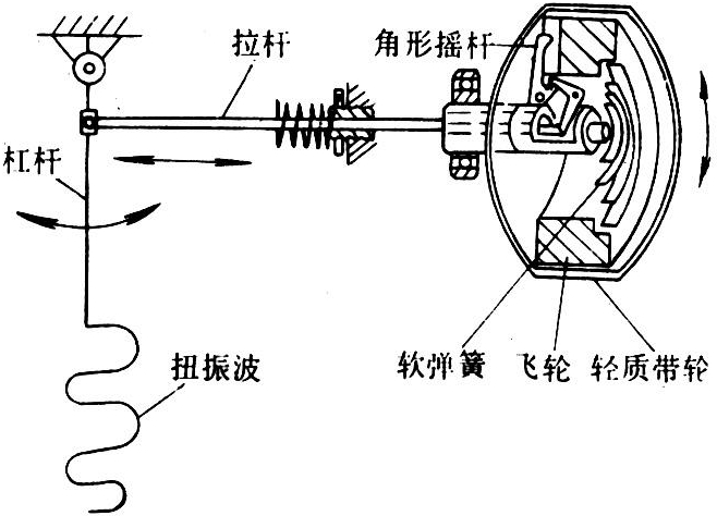 典型的机械或扭振仪是盖格尔(Geiger)扭振仪,其结构及工作原理如图1所示。转轴产生的扭振角位移,通过不可伸长的皮带或专用弹性联轴节传至轻质带轮,由于它的惯性很小而能随扭振轴一起振动,惯量很大的飞轮借一个不能传递高频振动的软弹簧与轻质带轮相联只作“匀速”回转,这样转轴上的扭转振动就反映为轻质带轮与飞轮间的相对位移,并通过装在轻质带轮上(一头嵌入飞轮)的一对互相垂直的角形摇杆,将相对角位移转为拉杆的往复运动,经杠杆放大将扭振波录于记录纸上。另有定频振子和记时器同时记录绝对与相对时间供扭振谐波分析。