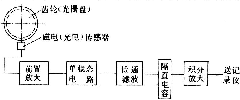 非接触扭振仪基于磁电或光电脉冲原理如图3所示。齿轮(或光栅盘)置于被测旋转轴上,磁电(光电)传感器安装在固定机械上,当转轴匀速旋转时,传感器感应出的脉冲信号重复频率不变,当存在扭振时就感应出扭振相应的脉冲重复频率变化的信号,经前置放大推动单稳态电路工作,发出的单稳信号其重复频率变化相应于扭振角速度的变化,经低通滤波转换成电压变化波动再经电容隔去直流成分,积分后就获得相应于扭振角位移变化的电压波动。这种仪器并伴随有扭振测量,谐波分析,波形记录置于一体的型式,具有结构简单、使用方便、便于分析等优点。