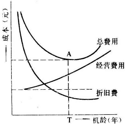 如图,在农业机器使用过程中,机器经营费用(维修费)不断增长,而机器折旧费逐年下降。二者费用之和构成总费用,其最小点A对应的点T即为最佳更新年限。常用的计算方法有:①账面价值统计计算法,即面值法。主要根据同类设备账面记载的价值数据。以所统计的折旧费及作业成本中算出平均使用成本,再将各年的平均使用成本加以比较,以其数值最低者确定为最佳更新年限。在农业机器工作的技术档案、成本记录完整不间断时,用面值法确定机器设备更新年限简单易行,准确可靠。②微分求极值法。对农业机器年度平均总费用的计算公式,用微分法求其数值为最小时的使用年限,即为最佳更新年限: