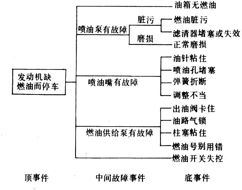检测所得机器性能指标大多是综合性指标(如发动机功率),若这些指标恶化超过一定限度,表明已出现故障征兆。需用故障树法分析有关因素,查找故障起因。