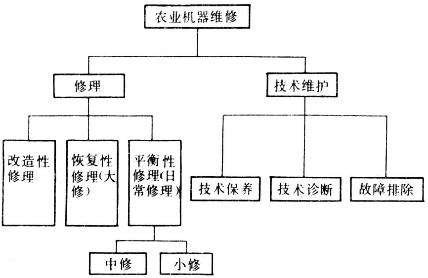 如图所示,技术维护部分包括技术保养、技术诊断(见农业机器技术诊断)和故障排除;修理部分包括平衡性修理、恢复性修理和改造性修理。