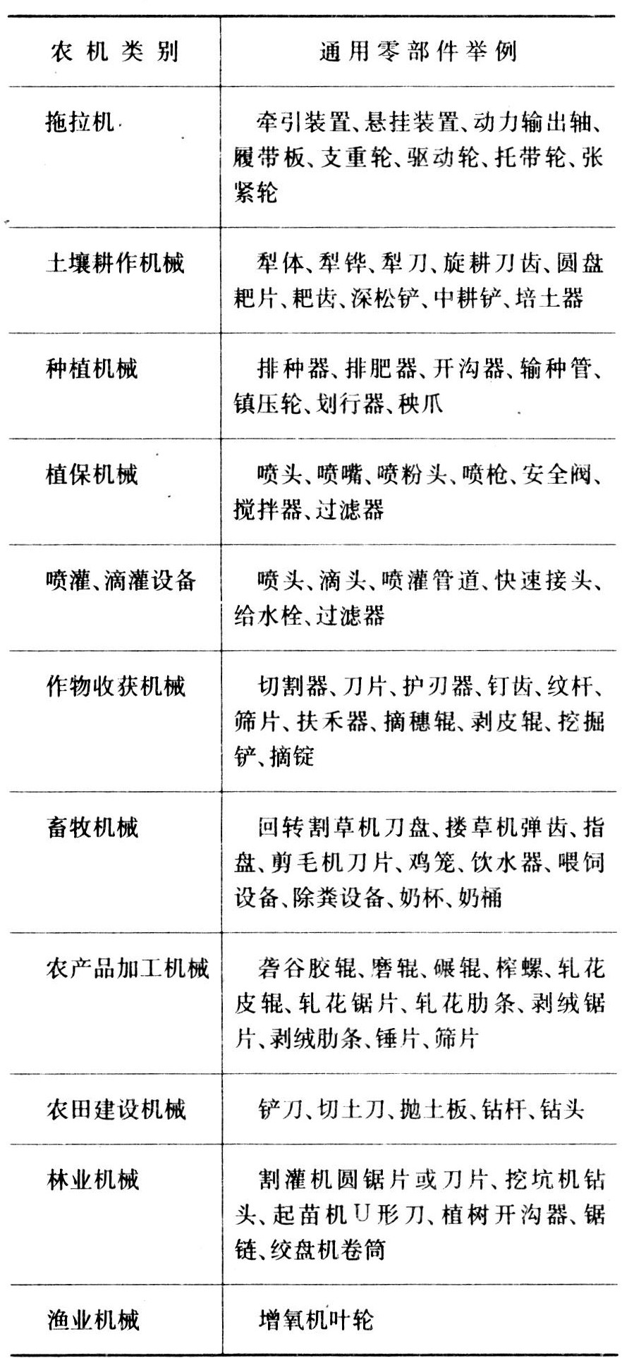 按零部件的通用化程度,可分为:①标准件。包括各种紧固件和联接件、轴承和润滑油杯、各种传动带和链条、管路附件和密封件、轮辋和轮胎以及各种电器仪表等。其规格尺寸已全部标准化,并适用于整个机械行业。一般由专业厂大量生产。②一般通用零部件。包括各种风机、泵、输送装置、联轴器、离合器、制动器、齿轮、链轮、带轮、液压元件、起重件、操作件等。其主要尺寸已标准化,并按不同机械行业的需要进行专业化生产,农机行业可直接选用这类零部件,或根据需要进行变型设计。随着通用化程度的不断提高,这类通用零部件也可能发展成为标准件。③通用零部件。是在农业机械产品范围内具有不同程度通用化的零部件。其中多数是在同一类农机产品中通用,有些则可用于不同类的农机产品。如某些筛片既可用于作物收获机械,也可用于农产品加工机械。有许多这类通用零部件的规格尺寸也已实现了标准化。各类农机主要通用零部件见下表。
