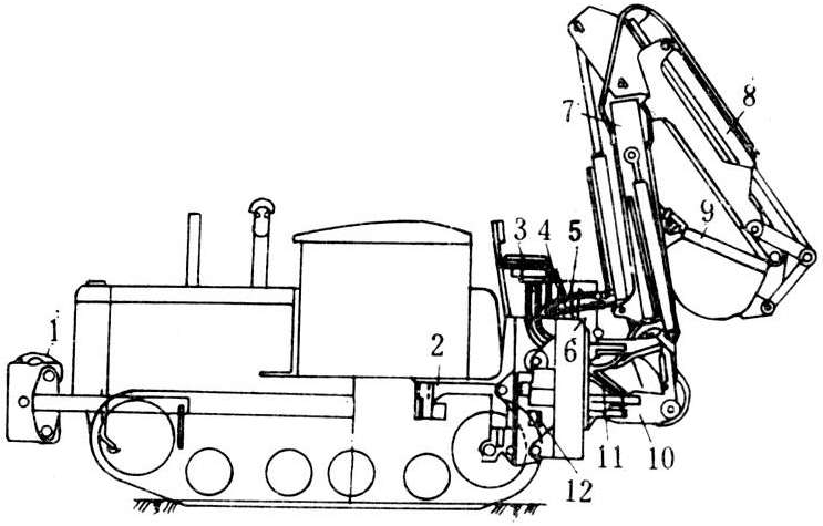 靠液压操纵的铲斗进行挖土的机械。与拖拉机配套使用。