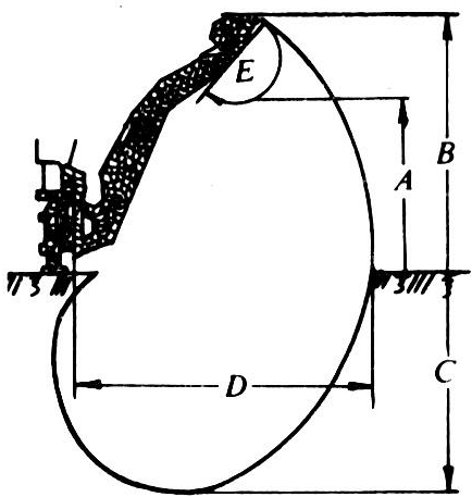 农用液压挖掘机是固定作业机组。在挖掘作业时,对准作业区先把支脚放下,牢靠地支撑在地面上并使拖拉机的行走装置基本不受力。然后放下动臂使铲斗扣到需挖之处,联合操纵斗柄油缸和铲斗油缸,使铲斗的斗齿切入土中,边挖边装入斗内;挖满一斗后提升动臂,并使回转油缸动作,将工作装置水平回转到指定卸土地点后,再翻动铲斗卸土。完成一个挖掘范围后,使机组移动一定距离,再重复上述挖掘过程。一个挖掘过程中铲斗齿尖在纵向平面内的轨迹如图2。最大挖掘范围因拖拉机功率的大小而不同。功率在36~73千瓦时,最大挖掘深度为3.2~3.6米,最大挖掘半径为4.2~4.8米,最大卸料高度为2.8~3.0米。通常一个挖掘循环过程需要10~15秒。