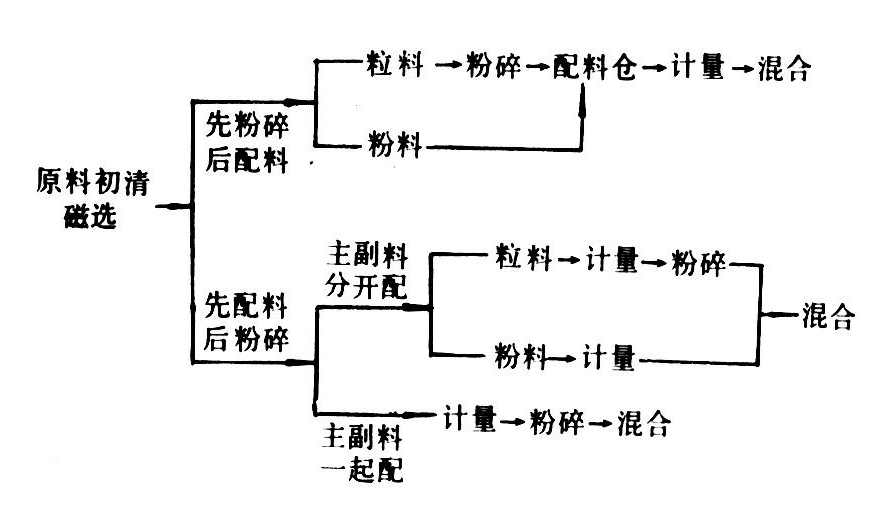 按产品的类型可分粉状配合饲料和颗粒状配合饲料两种工艺流程。粉状配合饲料的工艺流程中所用设备有粒料仓、粉料仓、粉碎机、计量器、混合机、成品仓和输送装置等;颗粒配合饲料的工艺流程中除上述各部分设备外还有制粒机、冷却器、油脂喷涂机、振动筛、碎粒机和蒸汽锅炉等。