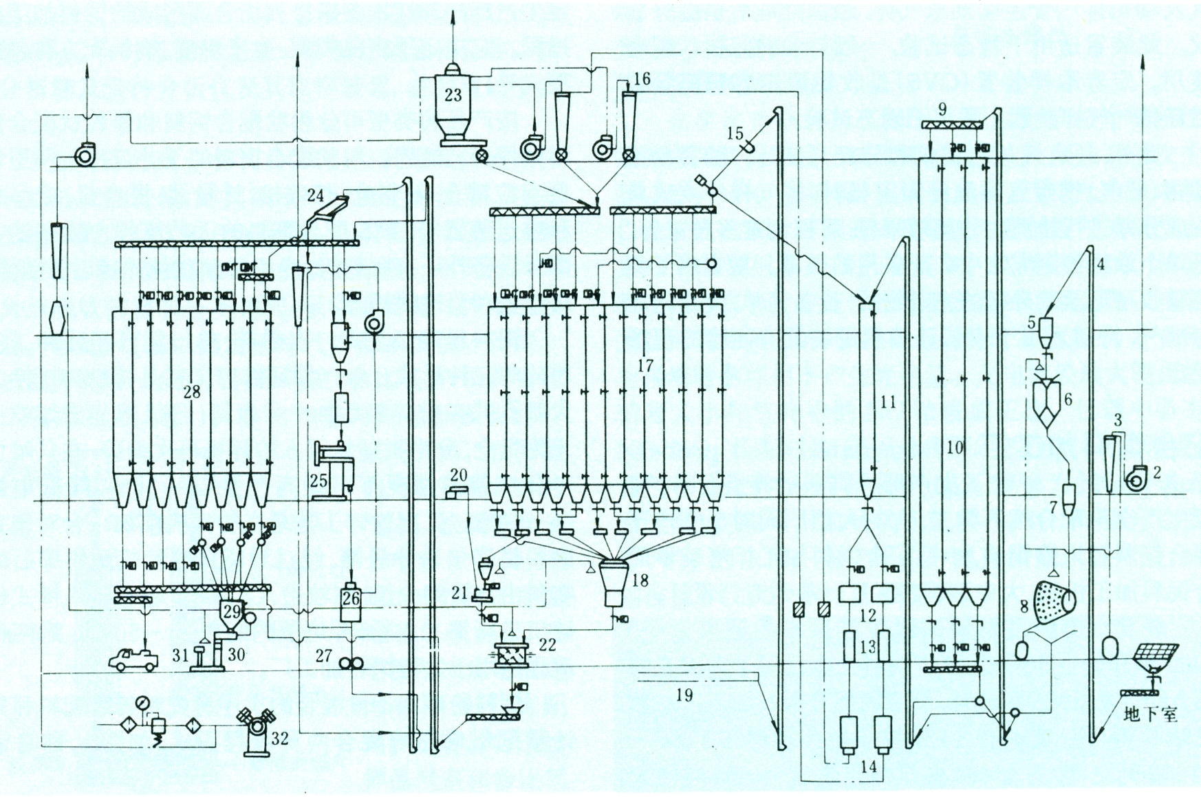 图2为能生产粉状和颗粒状配合饲料的单班年产10000吨(小时产5吨)配合饲料加工厂的工艺流程。它采用了一次粉碎,先粉碎后配料,由主料大电子秤和微量元素小电子秤分别进行的重量式多仓一秤计量,先压制成大颗粒后破碎成小颗粒。成品可由袋装或散装,整个系统实现了自动和半自动控制,并提供有蒸汽以压制颗粒,提供压缩空气供给各气动闸门和脉冲除尘器。