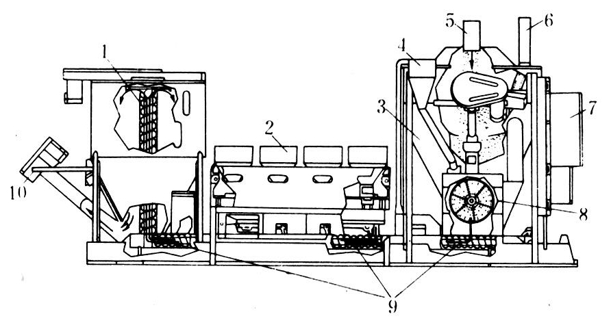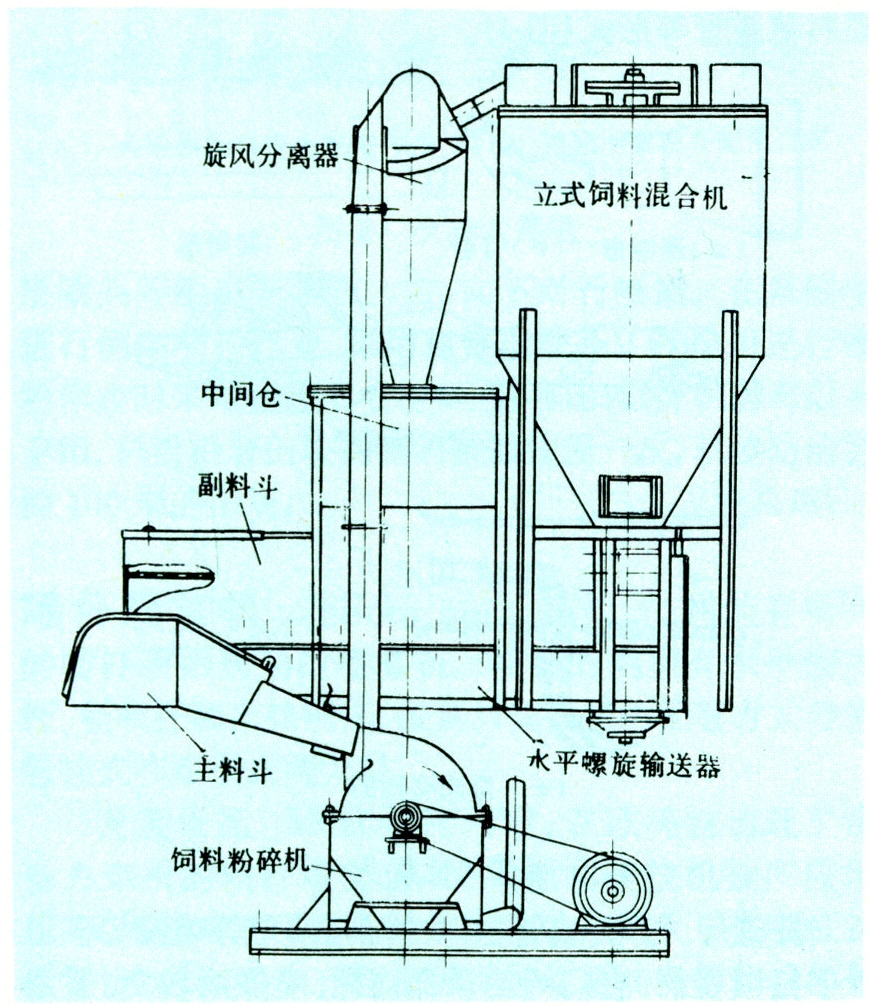 中国生产的1.0吨/小时级粉料加工机组结构如图1,适用于3000头猪或4.5万只鸡。由人工计量,分批作业。谷粒经称量后倒入主料斗,经饲料粉碎机粉碎后由风机吹入旋风分离器,沉降后落入中间仓,副料经称量后从副料仓加入。两仓内饲料由水平螺旋输送器送入立式饲料混合机混合,混合均匀后即卸料,由人工称重装袋。