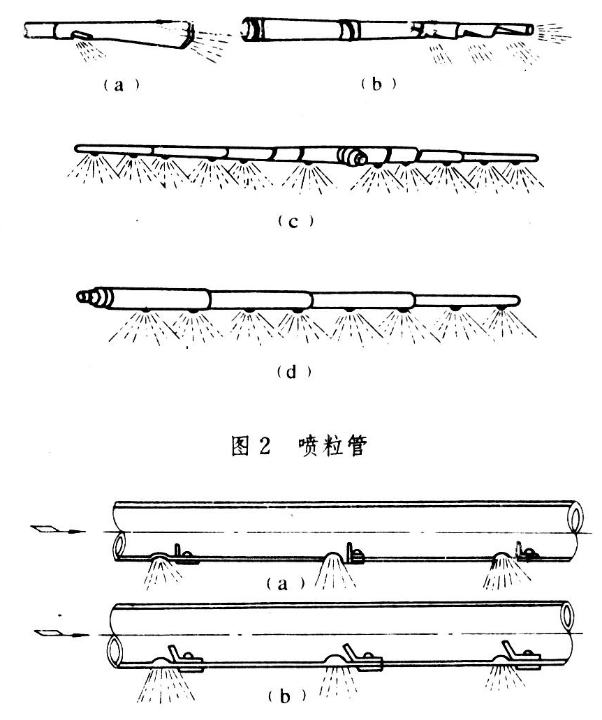 喷粒管也有多种形状,如图2。使用时装在风机出风口的弯管上,可针对作物下部喷撒粒剂或肥料。图2(a)为用于稻田的喷粒管,可自田埂向两侧喷撒粒剂或肥料;(b)为田边作业式多孔喷粒管,射程可达10~18米,效率比前者提高;(c)为T型水平喷粒管,由8节短管组成,总长7米;(d)为Ⅰ型水平喷粒管,由4节短管组成,总长3.5米。