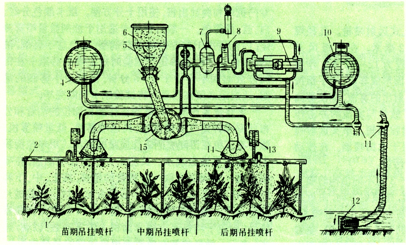 为适应多用途的要求,可根据不同作物及作物不同生长期和病虫害发生部位,合理选用喷杆型式,如棉花中、后期病虫害防治,以及在叶的背面发生虫害时,应选用吊挂喷杆。喷头亦可配置旋水芯式圆锥雾喷头和狭缝式扇形雾喷头两种。扇形喷头用于喷除草剂。喷粉管采用聚乙烯薄膜管,管上有许多喷孔,喷幅一般为8~10米,所用液泵多为双缸活塞泵,工作压力为300~900千帕。风机多为离心式,风量一般为0.6~0.7米3/秒。药液箱有两个,分置于拖拉机发动机两侧,根据配套拖拉机不同,容积为500~1000升。