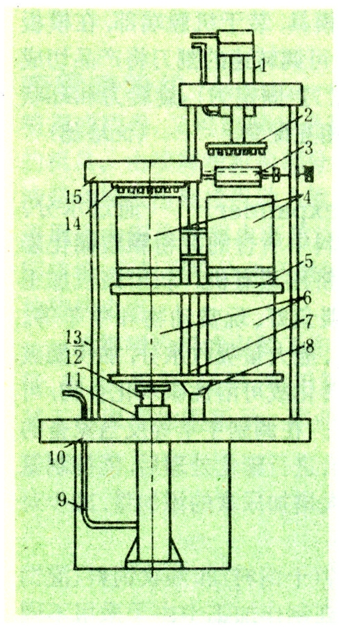 压缩装置(油缸)处于棉包箱顶部的为上压式,处于底部的为下顶式。以下顶式使用较多。油压下顶式打包机结构如图。由电动机驱动油泵,使高压油进入油缸,推动柱塞从下往上顶起,对棉包箱内棉纤维进行压缩。油缸柱塞压力为15~24兆帕,它匹配的是自动变量泵,泵的流量和压力,两者之间近似按恒功率关系变化,符合棉纤维压缩特性的要求。油压式打包机具有打包速度快,棉包压缩密度高(可达500千克/米3),安全可靠,操作简单并易实现自动化等特点,将逐渐取代机械式打包机。