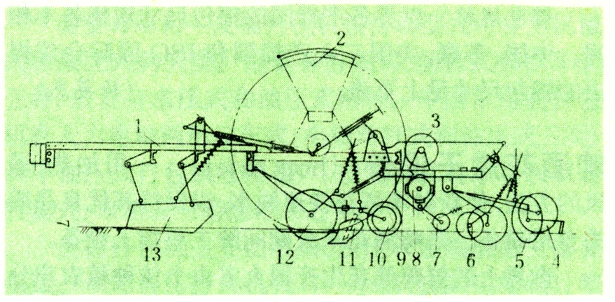 其结构如图2。每个播种单组配置两行开沟、播种、施肥等工作部件,并设一卷塑料薄膜和相应的展膜、压膜装置。作业时,肥料箱内化肥由排肥轮送入输肥管,经施肥开沟器施在种行的一侧,平土器将地表干土及土块推出种床外,并填平肥料沟,同时开出两条压膜小沟,由镇压辊将种床压平。塑料薄膜经展膜辊铺至种床上,由压膜轮将其横向拉紧,并使膜边压入两侧的小沟内,由覆土圆盘在膜边盖土。种子箱内种子经输种管进入穴播滚筒的种子分配箱,随穴播滚筒一起转动的取种圆盘通过种子分配箱时,从侧面接受种子进入取种盘的倾斜型孔,并经挡盘卸种后进入种道,随穴播滚筒转动而落入鸭嘴端部。当鸭嘴穿膜打孔达下死点时,凸轮打开活动鸭嘴,使种子落入穴中,鸭嘴出土后,由弹簧使活动鸭嘴关闭。此时,后覆土圆盘翻起的碎土,小部分经锥形滤网进入覆土推送器,横向推进至穴行覆盖在穴孔上,其余大部分碎土压在膜边上。