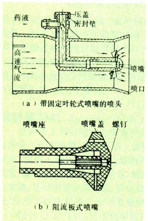 外混式气力喷头可配用多种喷嘴,如固定叶轮式、阻流板式、导风式、撞击板式等。如图为背负式机动喷雾机上配用的外混式气力喷头及两种喷嘴的结构。固定叶轮式喷嘴装有8个叶片的叶轮,每个叶片扭曲成一定角度,喷孔位于叶片背面,孔径一般为8毫米,共8个孔。高速气流撞击在叶轮上,产生气体涡流,将叶轮上来自8个喷孔的液流分散成液膜,进而由高速气流将液膜破碎成细小雾滴。阻流板式喷嘴由喷嘴座和喷嘴盖组成,用螺钉固定。有8个导风孔和8个喷液孔。喷嘴座迎风面成锥形,其作用是使流道面积减小,增加气流速度。其工作原理和固定叶轮式喷嘴基本相同。所不同的是利用部分高速气流撞击8个导风孔产生气体涡流,将药液预先分散成液膜。阻流板式喷嘴的喷幅较宽,但雾滴较粗。