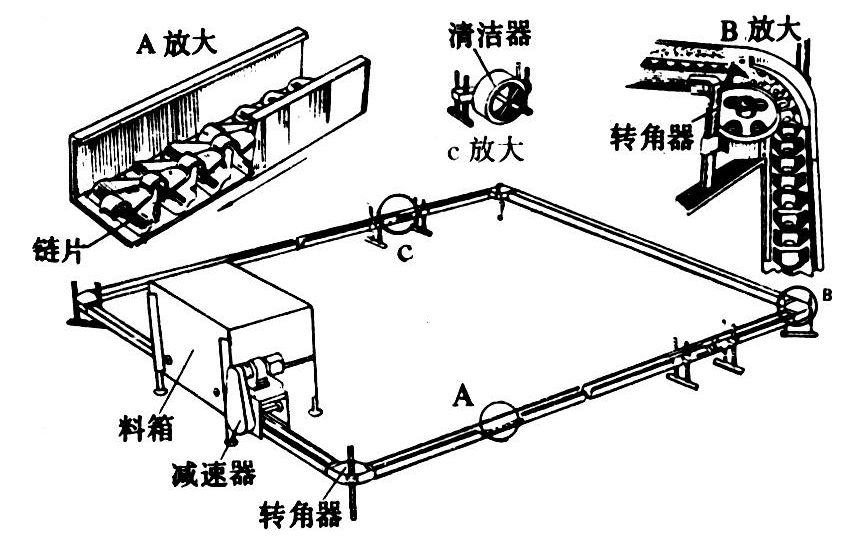 可用于平养或笼养不同大小的家禽。它主要由料箱、长饲槽、转角器、链片、减速器和电动机等组成。平养链片式喂料机还设有清洁器、升降机构和防栖钢丝等。图1为平养链片式喂料机示意图。相互钩连的链片在链轮带动下,经料箱、饲槽、转角器再返回料箱,并不断循环运动。链片托着饲料进入饲槽,饲槽中多余饲料又返回料箱。一台喂料机可有1~3条饲槽。转角器用来改变链片的运动方向。链片式喂料机最大工作长度约300米。平养时采用清洁器可清除混入饲料中的垫料、羽毛等杂质。喂料机运转时,饲料从饲槽进入清洁器,清洁器内有筛状滚筒,可以筛净饲料,清洁后的饲料由滚筒外壁上的螺旋刮板送回饲槽,而杂质则沿滚筒内壁抛至地上。饲槽的高度可以调节,以适应禽体高度的变化。笼养链片式喂料机和平养链片式类似,但为多层,层数与笼组层数相同,各层喂料由统一传动机构传动或分层传动。链片式喂料机适用范围广,工作平稳,功率消耗低,饲料可回收。但易引起家禽偏食,饲料易污染,长饲槽不利于平养家禽的活动。