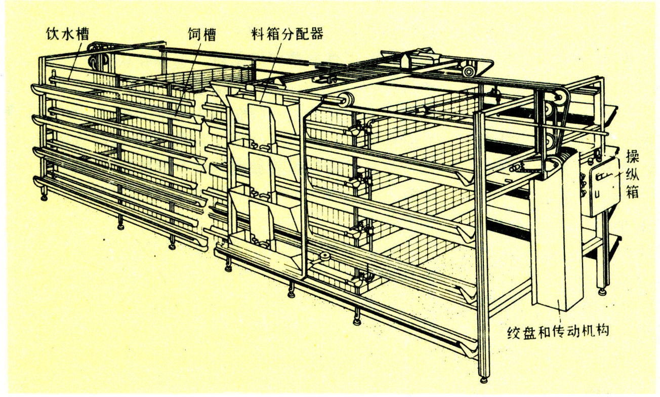 仅用于笼养。它由料箱、机架、牵引绳、绞盘、电动机和传动机构等组成(图2)。缆车可支撑在笼组上部或下部,也可将各层料箱分别支持在各层饲槽上。对于叠层式笼养,导轨常位于笼组的上部,而半阶梯式和阶梯式笼养常采用分层支撑,可不设专用导轨。缆车式喂料机应有控制排料量和排料均匀度的装置。一般是在料箱下部设强制排料器,或在料箱的出料口处设可调刮板和浮动料筒,半机械化养禽场常采用地面移动式喂料机,由动力或人力驱动,在向前移动的同时,向两侧或一侧笼组饲槽分配饲料。缆车式喂料机结构简单,设备费用低,但自动化程度往往较低。