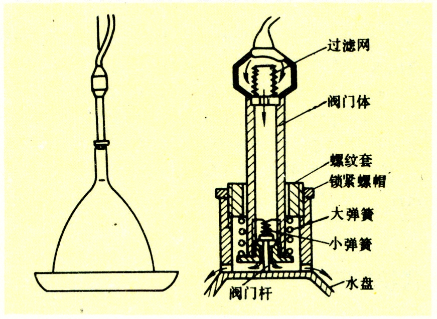 由水盘和大小弹簧等组成(图1)。使用时饮水器悬吊空中,并以软管与输水管相连。当水盘无水或少水时,在大弹簧的作用下水盘上升,从而克服小弹簧的张力,打开进水口,水即流入水盘;当水盘有足够的水,即饮水器整体重量增大时,大弹簧被压缩,水盘下降,在小弹簧的作用下进水口被关闭。家禽饮水时,水盘始终保持预定的水量。水盘的水量调节可通过改变对大弹簧的预紧力来实现。吊塔式饮水器有低压式和高压式两种,低压式要求最高水压不大于68千帕,而高压式则与自来水管压力相当,可直接与自来水管相连。它主要用于平养雏鸡、肉鸡、成鸡和火鸡等,是平养家禽的主要饮水设备。与自控式长槽饮水器相比,高度调节自如,又不妨碍家禽活动。
