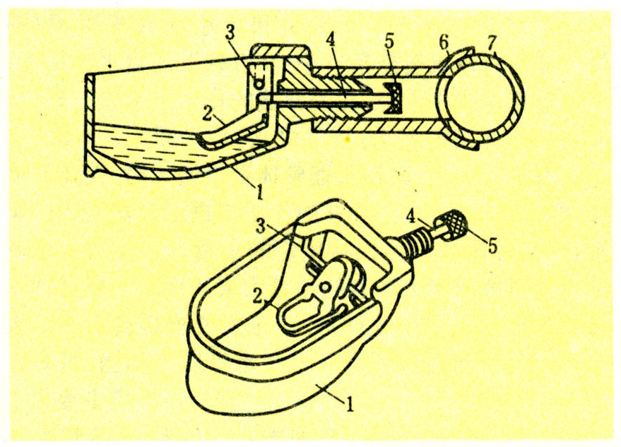 由水杯、触发板、阀杆和橡胶塞等组成(图2),器体直接与输水管相连。当家禽啄动触发板时阀杆受到推移,从而打开橡胶塞阀门,水即自水管流入水杯供家禽饮用。由于水的压力,橡胶塞处于常闭状态。要求水压,幼雏为10~24千帕,成禽为30~70千帕。该饮水器可用于平养和笼养。优点是节约用水,又不易以水为媒介传染疾病。缺点是对水质、水压有较严的要求,需设置过滤器和减压阀。