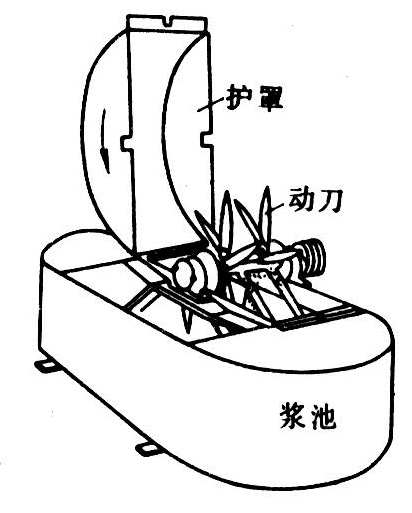 加水式打浆机由转子、椭圆形浆池、机盖及传动装置等组成(图)。转子上有8~12把动刀。作业时,先向浆池中加入清水,再启动打浆机,达到额定转速后投入一份青饲料;青饲料在浆池内随被转子搅动的水流循环流动,多次受到动刀的冲击、砍切和搓擦,逐渐成浆;当达到一定粗细度后即可从浆池底端放料。通常转子直径为500毫米,转速1450~2000转/分,配套动力为3~5.5千瓦,打青苜蓿时生产率为120~150千克/小时。