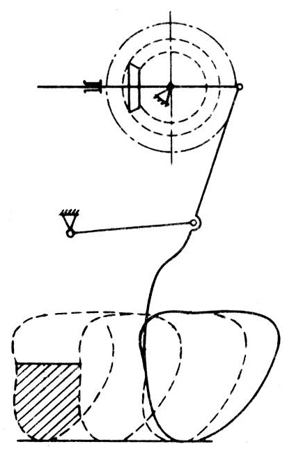 一种用机器摹仿人手用锹挖土的动作来进行土壤耕作的机械。英国人在19世纪中叶首创的动力锹,是用蒸汽拖拉机作动力,装上三组曲柄连杆机构,并在每组机构上安装一个七齿铁叉。近代动力锹和当时所用的原理完全相同,只是把叉式锹改为铲式锹。并与一个包括曲柄在内的四杆机构相联结。曲柄由锥齿轮驱动。铲尖的运动轨迹和人手扶锹铲挖土的动作一样(图4),铲尖垂直入土,切下土块(图中的阴影部分),然后向上提起。改变曲柄转速和改变机组前进速度可调节土块的大小。工作时前进速度一般约2千米/小时。动力锹在潮湿地、粘土地以及植物根系密结的土地耕作,可以获得大小均匀的土块,耕后地面平整。意大利制造的动力锹,最大深度可达40厘米,与80千瓦以上的拖拉机配套,工作幅宽2~3米。锹形有平头铲、圆弧铲、尖头球面铲等多种。但动力锹结构较复杂,制造成本高,工作时由于锹的往复运动而产生的振动较大。