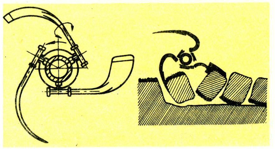 锄铲安装在水平横轴上,交错排列。横轴由拖拉机动力输出轴驱动,转速一般为40~80转/分。传动方式和整机结构与旋耕机相同。为了使切下的土块能完全翻转,有的旋转锄的锄铲上装有一个弹性薄钢片,铲刃切土时,薄钢片随其切缝弯曲,插入并托住土块,利用摩擦力及锄铲的旋转运动将土块翻转,上下倒置,顺序排列。还有一种辅助翻垡装置是将锄铲的圆柱型柄端装在转动轴上的套管内(图5)。空心的转动轴内部还有一个静止的心轴,轴上有一导槽,铲柄上的横销嵌在导槽内。当锄铲切下土块并将其带到一定的高度时,铲柄上的横销就碰到导槽的斜凸部分,从而迫使锄铲产生偏转,土块就被翻转下落。