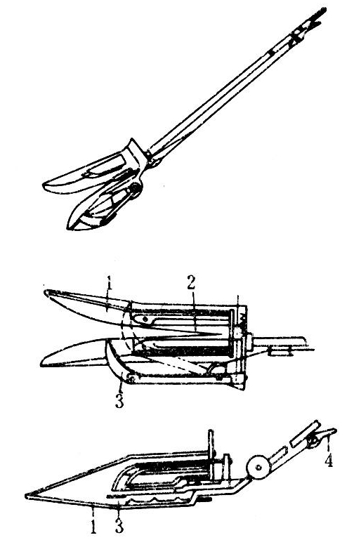 又称快速割禾器、推割式人力收割机。最早的人力割禾器于1898年由日本兵库县松村竹夫发明。到1950年前后,日本开始市售日产式人力割禾器(图2),每年生产约3万~5万台。在船形底板两侧有导向杆,内侧固定着V字形的刀片。人推着割禾器贴地前进时,作物靠惯性支承而被切断。割下一束后停下来,将操纵杆往上提,使辅助镰刀杆向右转,把已割作物和未割作物分开,并扶持割下的作物防止前倒,然后将其以集束状态翻倒于地面。用人力割禾器收割作物,人可避免弯腰,功效比用小镰刀高,但要掌握操作要领。