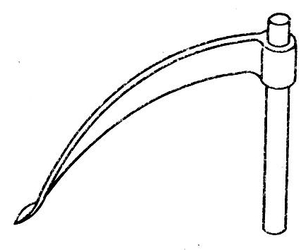 主要在产棉区连根收获棉杆时使用。其形状如图3,镰长约30~40厘米,比较厚重,刃部不锋利,因其功用不是砍削而是钩拔。尖部微向下弯,装在短木柄上。有时在柄头系上一个皮套或绳套,以便套在右腕上更便于用力。工作时,右手用力将钩镰凿入棉根的下方,左手握住棉杆往左侧下按,右手随即用力向上一钩,棉杆即被连根拔出。