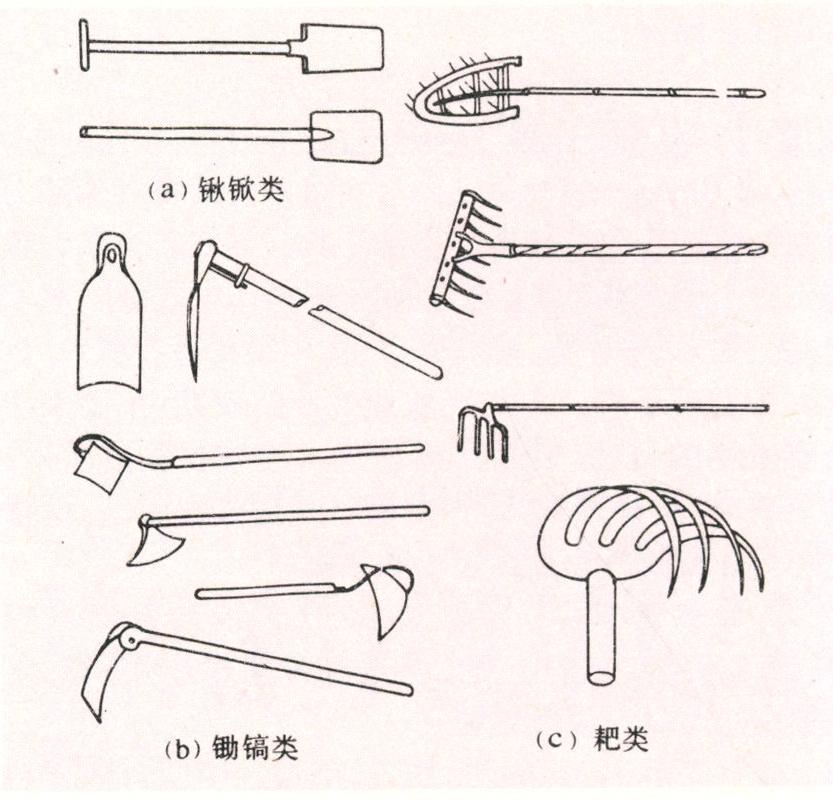 用于土壤耕作的手工具。人力耕作工具历史悠久,品种繁多。在手用农具中占很大比重。中国在距今5000年前的龙山文化时期已使用了木制松土工具耒耜;战国时代(公元前475~前221年)已有了锸、钁等铁制整地工具与铲、锄等中耕除草工具。中华民族在长期的耕作实践中创造发明的各式各样的人力耕作工具有20余种。这些工具用来翻耕土地,松碎土壤,平整地表,起垄作畦,中耕除草,在农业生产中发挥了重要的作用。中国农村现在还普遍使用的主要人力耕作工具如图。20世纪60年代初期中国每个劳动力平均占有手用农具5.5件,其中锨、镐、锄3件约占40%。70年代中国手用农具的年产量约4亿~5亿件,其中钢制的锨、镐等优质产品远销亚、非和中东等地区。70年代末锨、镐、锄的年平均出口量约400万件。