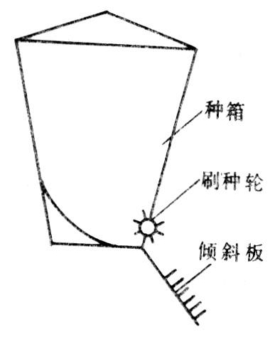由种箱、刷种轮、倾斜板等组成(图1)。种箱长约3~5米,箱底每隔一定距离(约15厘米)开有一落种孔。为防止种子在种箱内架空,在落种口处装有旋转的刷种轮,种子被导向落种口靠自重落下。种箱下方有一倾斜板,板面上固定若干排三角柱(圆柱或钉状凸起物)。倾斜板对下落的种子起分流作用,使之撒得更均匀。