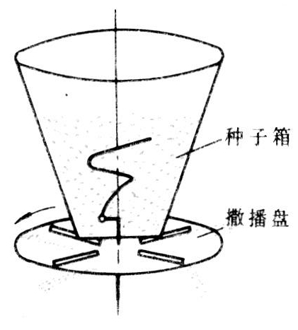 一般为拖拉机悬挂式,也可附装在农用运输车的后部。由种子箱及其下方的一个高速旋转的撒播盘构成(图2)。种子箱中装有搅拌器,有的还在排种口装有倒V型分流器,用以分散种子或肥料流。撒播盘的转速一般为500~1000转/分,由运输车的地轮通过链条传动。种子由种子箱落至撒播盘上,在离心力作用下沿切线方向撒出。播幅大小与种子的物理特性(尺寸、形状、密度)、撒播盘的构造、转速和离地高度等有关,一般可达6~15米。这种撒播机也可以施撒粉状或粒状肥料、石灰及其他物料。