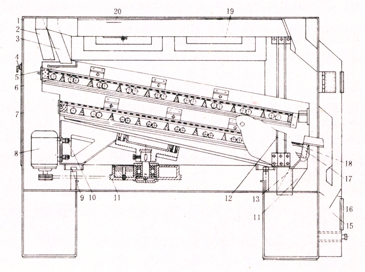 筛体振动频率较高而振幅较小的一种筛选设备。主要由进料装置、筛体及振动器、吸风装置及传动等部分组成。筛体分主筛和副筛,主筛有一层大杂筛面和两层小杂筛面,副筛装在主筛出料端底板下方,使小杂筛面的筛下物得以继续清理。整个筛体由4组刚度相等的螺旋弹簧支承在机架上。筛体振幅为1.5~2毫米,振动器主轴转速为1400~1500转/分,筛体在垂直面作近似的圆形运动,筛面上的物料是在沿筛面跳跃翻滚的状态下进行分选的,所以筛孔不易堵塞。用于粮食加工厂的稻谷除稗和清除小麦杂质等作业。