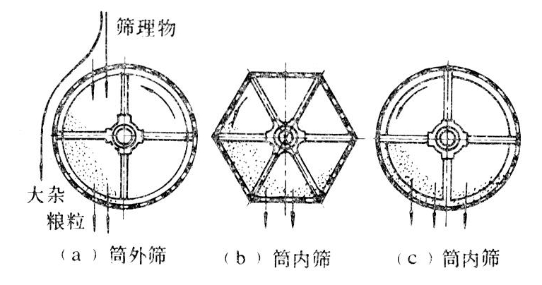 筛筒作等速旋转运动的一种筛选设备。筒筛的筛面呈圆筒形或六角形(图3)。筛筒与水平面呈3°~10°倾角,筛面多为金属丝编织的方孔筛网。筒筛按用途分筒外筛理和筒内筛理两种筛理方式。筒外筛理时,筛理物落在筒筛的外表面上,粮粒穿过筛孔下落,大杂则沿筒筛表面下滑而分离;筒内筛理时,筛理物进入筛筒,粮粒穿过筛孔下落,大杂则留在筒内,随筛筒旋转而排出。筒筛通常都配有吸风装置。在大型粮食和饲料加工厂里筒筛用作除去粮食中大杂和轻杂的初步清理设备。筒筛工作时应使物料产生的离心力小于其自身的重力,所以其转速不能过快,一般为10~25转/分。