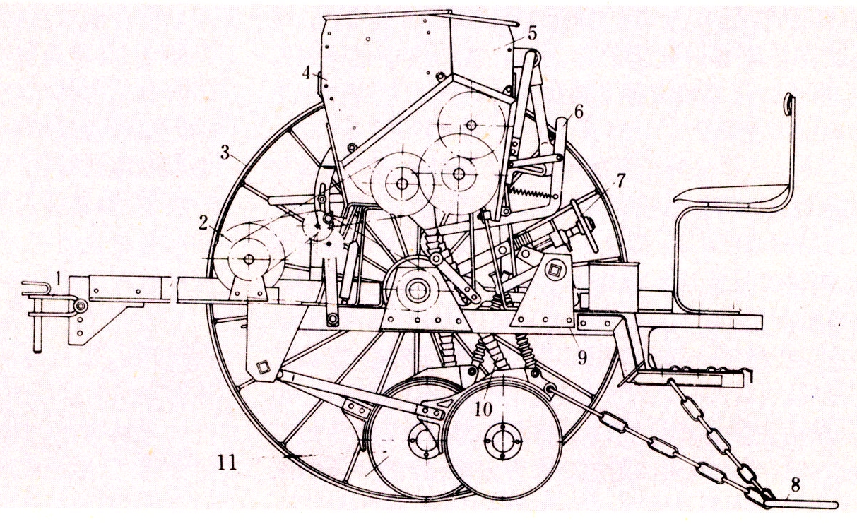 谷物施肥播种机结构如图。种肥箱为整体结构,中间有一隔板将其分为种子箱和肥料箱两部分。排种器和排肥器分别安装在种子箱和肥料箱底部,排出的种子和肥料各均入同一个种、肥漏斗内,经输种(肥)管落入由开沟器开出的种沟内,实现同位施肥。可省去专用的施肥开沟器和输肥管,使施肥播种机结构简单。