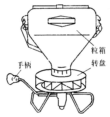 有三种形式:①手持式施粒器。利用粒剂的重力施布粒剂,又称人力重力施粒器。使用时,开关启闭管式容器下端的粒剂排出口,由一个锥面体调节粒剂排量,可以间断地或连续地施粒。主要用于单株作物根部的点处理及选择性杂草的防除。②手摇粒剂撒布器。结构如图1,转动手柄驱动带叶片的转盘旋转,将从粒箱落入转盘的粒剂撒布出去。主要用于全面撒施,并可用于施撒种子及肥料。③手持式粒剂点施器。粒箱为一小圆筒,筒的底部装有推杆和活门。施粒时,手持圆筒对着玉米心叶,揿压推杆便可使粒剂落下,用于防治玉米螟。