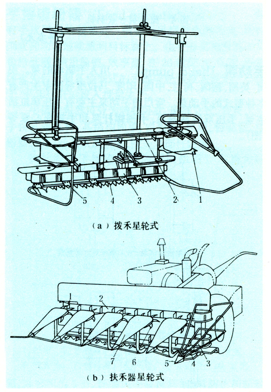 切割器和上下横向输送带由手扶拖拉机动力输出轴经传动机构驱动,而拨禾星轮和与之同轴的带拨齿的扶禾三角带由上输送带的拨齿带动。星轮拨齿均为后倾的弧形齿,便于卸草。