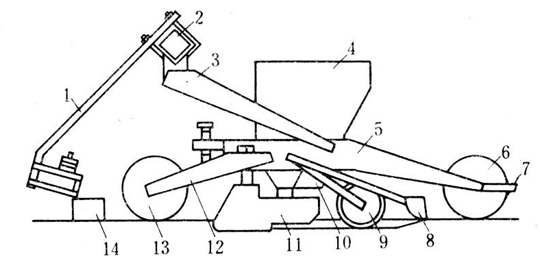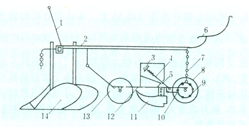 一种悬挂式蔬菜条播机。适用于大白菜、萝卜、芥菜、圆白菜的起垄播种,能一次完成起垄、播前镇压、开沟、播种、覆土和播后镇压等作业。其结构如图1,主要由机架、播种单组、起垄器等组成。作业时,起垄犁铧在已整好地上筑起垄台,前镇压轮将种床压平,滑刀式开沟器开出种沟,拉簧式排种器由后镇压轮上的拨指推动拨杆并拉伸排种弹簧而工作,挡种片定时将活门打开,种子自动流入种沟内,靠开沟器通过后的土壤自行回落覆土,后镇压轮进行播后镇压,完成起垄播种作业。