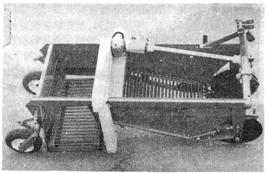 升运链式输送分离器由两条平行的链条、抖动机构及主被动链轮组成。在两链之间每隔一定间隔(26~31毫米)安装一钢制的杆条,组成栅筛(有的机器上把杆条两端弯成钩状,互相连接代替链条),使小杂物从杆条中漏下,薯块和大夹杂物则送至后续分离器上。输送器的抖动机构产生周期性振动,用来强化分离能力,帮助破碎土壤。最简单的抖动机构是椭圆形的托链轮,其长短径之比大于1∶2.5。也有用曲柄连杆驱动的抖动轮,在潮湿土壤条件下能使分离能力显著增强。