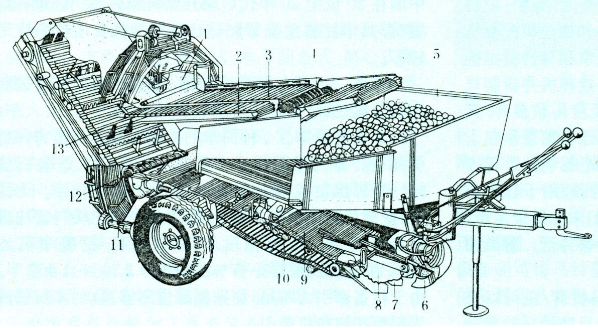 又称薯类收获机。能一次完成挖掘、分离和集条等工序。根据分离工作部件的形式,可分为挖抛机和升运链式挖掘机。挖抛机主要由挖掘铲和指杆状回转轮组成。工作时,挖出的薯块由挖掘铲上方的回转轮将土块打碎,同时把薯块抛至挖掘铲的一侧。该机型结构简单,但薯块损伤率高。升运链式挖掘机由挖掘铲、升运链等组成(图1)。工作时,被挖掘铲挖出的薯块和夹杂物通过抖动的升运链,使夹杂物从杆条间漏下,薯块向后输送至第二输送器,第二输送器有纵向和横向配置两种,前者加上集堆器可实现纵向堆放,后者则可侧向条放。铲侧的两个圆盘刀可防止薯块向两侧散落和铲上挂草,还能限制挖掘深度。这种挖掘机适用于在平原或在坡度小于8°的砂土和壤土地上工作,工作稳定可靠,每小时可收获1亩地,由22~33千瓦拖拉机牵引。薯类挖掘机结构简单,在小块地使用比较灵活。除可用来收获马铃薯和甘薯外,稍加改装后可兼收其它块茎和块根作物。缺点是机器重,升运链易磨损。