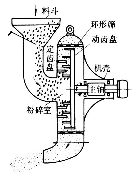 其结构如图2。由机壳、盛料斗、粉碎室和环形筛等组成。粉碎室由动齿盘和定齿盘组成。动齿盘上有3~4圈齿爪,定齿盘上有2~3圈齿爪,各圈齿爪交错排列。工作时,饲料原料由盛料斗通过进料控制闸板自动流入粉碎室的中央,受离心力和气流的作用,自内圈向外圈运动,在运动过程中,饲料受到动齿和定齿的多次冲击、搓擦而逐渐碎成细粉。同时由高速旋转的动齿盘形成的风压使细粉穿过环形筛孔排出,较大的颗粒仍留在筛圈内继续被粉碎,直到穿过筛孔为止。所配环形筛的孔径为0.5~3.5毫米,可根据饲料所要求的细度来加以选用。动齿盘外缘的旋转线速度为80~85米/秒。粉碎玉米的生产能力为45~55千克/千瓦小时。爪式粉碎机的特点是结构紧凑,粉碎粒度较细,适合于粉碎含纤维较少的精料。但耗能较多,齿爪易损坏和磨损,工作时的噪音较大。中国的爪式粉碎机已实现系列化,共有五种型号。