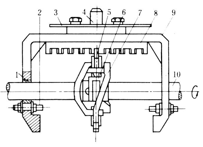 属间歇移箱机构,其结构如图1。移箱器工作时,由移箱器轴带动移箱盘转动,换向器螺旋面推动齿条移动1齿,移箱插头带动秧箱横向移动一个移距。当移箱结束,移箱盘体嵌入齿条时,秧箱就不再横向移动,起秧箱定位作用。移箱盘每转1周,秧箱移动一次。当齿条移到最后一个齿时,齿条架下端部的顶开销将移箱盘上的锁定卡顶开。齿条架尾部的换向头将换向器推向另一侧。锁定卡在锁定压簧的作用下,卡住换向器,齿条架即改为由另一方向的螺旋条推动往相反方向移动。