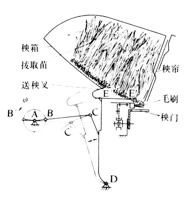 结构如图3。在秧爪取秧的宽度范围,秧爪每取秧一次相应送秧一次。送秧叉由曲柄连杆机构带动。当曲柄等速回转时,通过连杆带动摇杆上的送秧叉作往复运动。当移箱器移箱时,送秧叉退出秧箱;送秧叉送到秧箱最前点并开始后退一定距离后,秧爪进入秧箱取秧。为适应不同秧苗和调整送秧量,送秧叉与秧箱底板的垂直距离即送秧高度和送秧叉的前止点位置是可以调整的。适用于拔取苗插秧机。