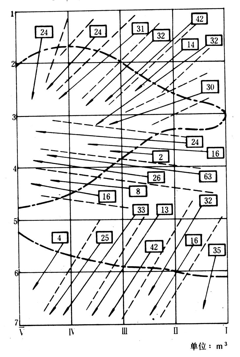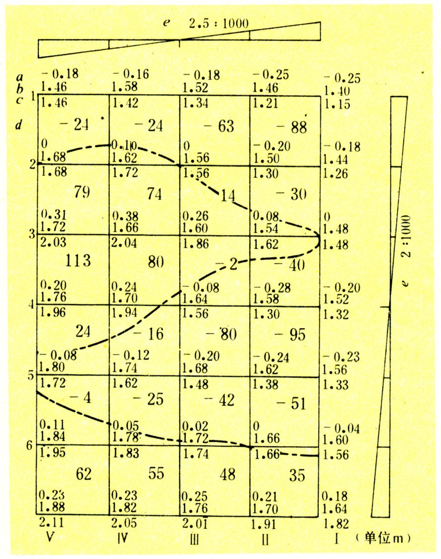 首先对平整单元进行测量,一般使用方格网法,如图1。沿边线方向相隔10~20米打上正方形方格点桩,用水准仪测出点桩处地表的实际高程;用加权平均法算出单元平均高程,平均点位于单元的中心;再按灌溉要求确定纵向和横向坡降比,确定各点设计高程;设计高程与实际高程的代数差即为该点的挖填高度(负值为挖深,正值为填高),标于方格图中。挖填高度为零的点的连线,即为挖填分界线。每个方格四个角点的挖填高度的代数和值乘以方格面积,即为方格挖填土方量。按运距短和路线不交叉对流的原则,制定调土路线,如图2设计的挖填土方数量大体平衡。如计算相差较大时,在允许的范围内适当调整平均高程或坡降比,使挖填土方大体平衡。由于土壤的膨松,并考虑其沉降,填方处可适当加高10~20%。